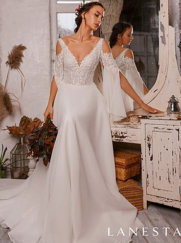 Splývavé svatební šaty, živůtek ze třpytivé kytičkové krajky, decentní srdcový výstřih krytý tělovou síťkou.Výrazné volánové rukávy. Splývavá jednoduchá sukně s vlečkou, holá záda. Slonová kost.