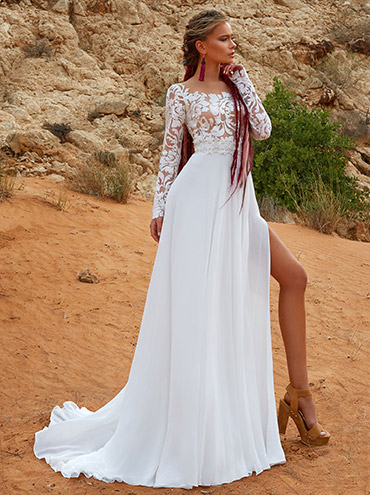 Svatební šaty se splývavější sukní, iluze hlubokého výstřihu se síťkou. Šaty vynikají třpytivou spodní vrstvou pod tylem. Celá záda jsou krytá síťkou. Zapínání na zip, vlečka.