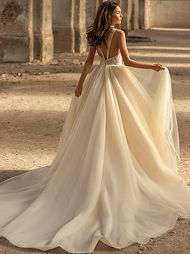 Šaty Kerry jsou vyrobeny z lehkého a nádherného tylu, který se perfektně hodí k jednoduchému svatebnímu looku. Hlubový V-výstřih vepředu a zajímá širší ramínky na zádech. Velká tylová sukně s vlečkou. Šaty zdobí krajka v místě pásku, která dodává trendy finální dotek.