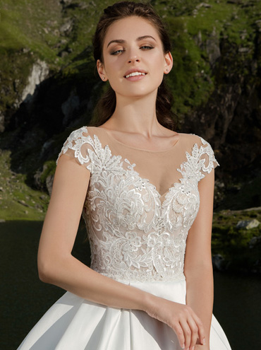 Skladový kus má sukni z materiálu ryps. Katalogový model má sukni saténovou.